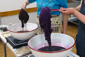 画像の作業はショールをオリジナルカラーに煮て染めているところ。売っていない、あなたのお好きな色にできますよ。エコブームの中、衣服の染め変えをする生徒さんもいらっしゃいます。