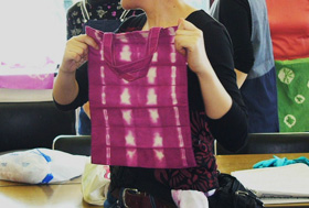 輪ゴムや板などを使用し、染料液に浸けても染まらない部分をわざとつくることで、様々なオリジナル模様が現れます。思いもよらない模様に感激です!